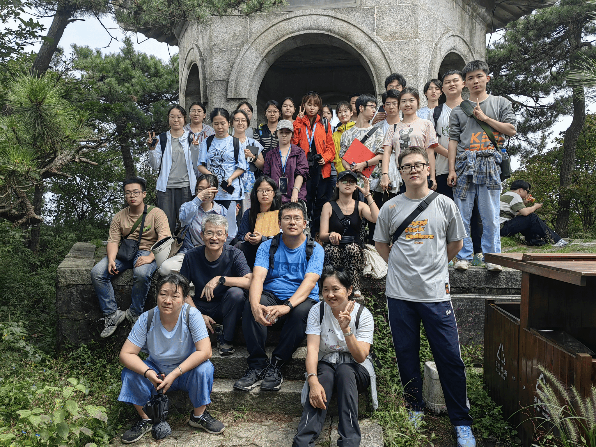 漫步花径,白居易笔下“人间四月芳菲尽,山寺桃花始盛开”的诗句不再抽象。身旁灼灼其华的桃花,与周围冷凉湿润的生态环境相互映衬,直观印证了海拔高度对物候的影响,让同学们在欣赏美景的同时,感受诗词与生态的完美融合。登上五老峰顶,嶙峋怪石与苍劲古松勾勒出雄浑壮阔的画面。听老师讲解1959年庐山会议在此召开的历史背景,以及抗战时期此地作为战略要地的重要意义,同学们深切体会到这片土地不仅承载着自然之美,更镌刻着厚重的时代记忆,领略到生态与人文交融的独特魅力。